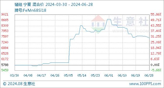 6月28日,生意社锰硅基准价为7570.00元/吨,与本月初(8725.00元/吨)相比,下降了-13.24%。