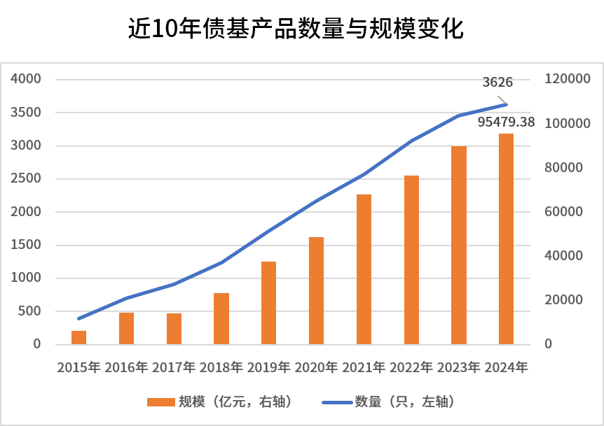 不仅仅是今年,债基近年来持续受到投资者的青睐,热度丝毫不减。目前,全市场债基数量达3626只,基金规模合计95479.38亿元,较2015年底的389只、6120.56亿元分别增长8倍和15倍多。