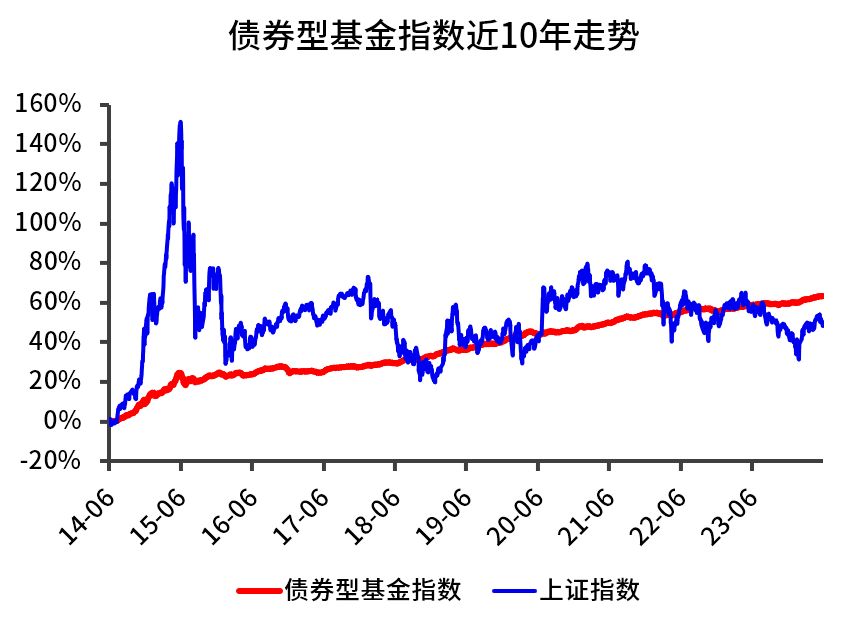 从债券型基金指数的历史走势也能看出,其收益率曲线相比上证指数明显更为平滑,虽然也有一些“小波动”,但整体呈现长期逐步攀升的态势,这无疑能够带给投资者更为舒适的投资理财体验。近十年,债券型基金指数的年化波动率、最大回撤为2.40%、-5.00%,远小于上证指数同期19.78%、-52.30%的年化波动率、最大回撤。(截至2024年6月10日。指数数据仅供参考,不作为任何投资建议或收益暗示。指数过往涨幅不预示其未来表现,也不代表跟踪该指数的指数基金未来业绩。)