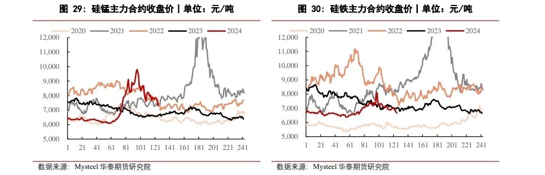 硅铁方面,昨日硅铁主力合约收于6672元/吨,较前日下跌88元/吨,单日增仓1934手。现货方面,主产区72硅铁自然块报价在6500-6600元/吨,75硅铁自然块价格7000-7200元/吨。目前硅铁行业利润较高,产能充裕,淡季铁水产量增幅受限,叠加上周钢厂利润回落明显,硅铁消费弱稳运行,预计短期价格维持震荡运行。