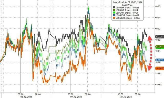 由于美联储主席鲍威尔在出席国会第二天听证“放鸽”,以及美国10年期国债标售稳健令国债买盘小幅增加,美债收益率全线走低。