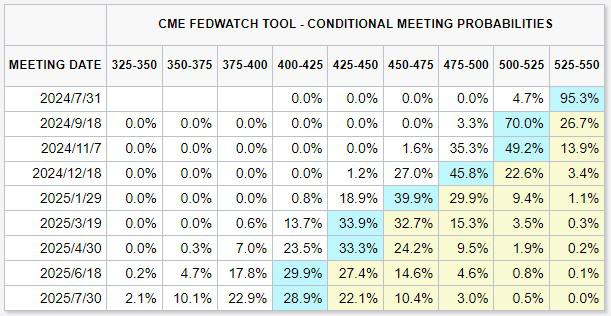掉期交易员坚持对今年两次降息的预期,Fedwatch显示9月降息概率为70%,市场预期9月和12月均降息一次。