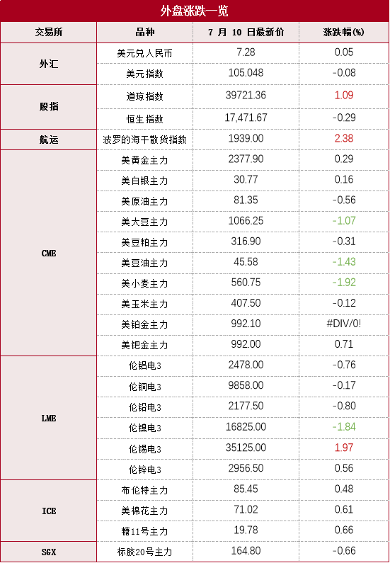 隔夜,LME铜收跌17美元,跌幅0.17%,LME铝收跌19美元,跌幅0.76%,LME锌收涨16美元,涨幅0.56%,LME镍收跌315美元,跌幅1.84%,LME锡收涨680美元,涨幅1.97%,LME铅收跌17美元,跌幅0.8%。消息面:美联储主席鲍威尔在参议院发表半年度货币政策证词时表示,近期通胀数据显示通胀朝着2%目标有一定的进展。中国6月CPI同比上涨0.2%,环比下降0.2%;6月PPI环比下降0.2%,上月上涨0.2%。据中汽协数据,6月汽车产销分别完成250.7万辆和255.2万辆,环比分别增长5.7%和5.6%,同比分别下降2.1%和2.7%。其中,新能源汽车产销分别完成100.3万辆和104.9万辆,同比分别增长28.1%和30.1%。6月份中国电解铝行业含税完全成本平均值为17,680元/吨,环比增长2.76%,同比增长12.82%,主因氧化铝月度均价大幅上涨。最新全国主流地区铜库存减1.18万吨至39.8万吨,国内电解铝社会库存增1.77万吨至79.1万吨,铝棒库存增0.68万吨至14.65万吨,七地锌库存增0.16万吨至19.99万吨。金属库存小幅回落,欧洲率先降息,美联储按兵不动,美元震荡。操作建议,短线偏空交易思路为主。观点仅供参考。