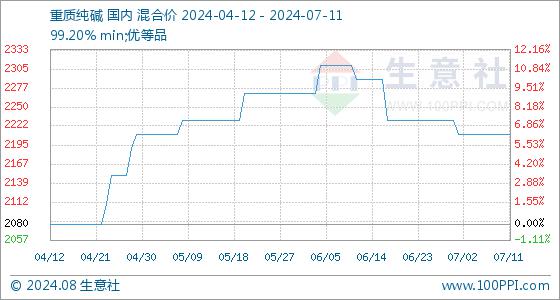 7月11日,生意社重质纯碱基准价为2210.00元/吨,与本月初(2230.00元/吨)相比,下降了-0.90%。