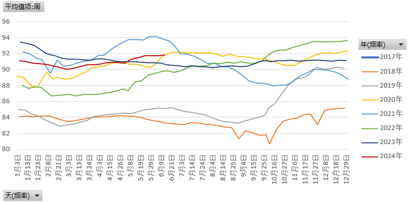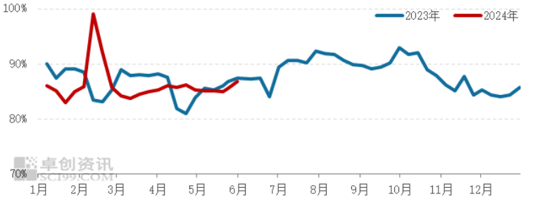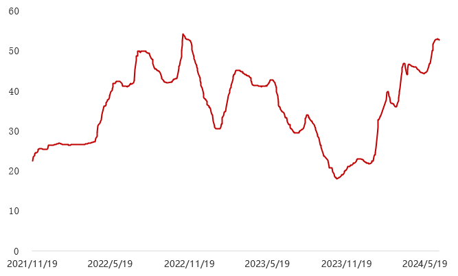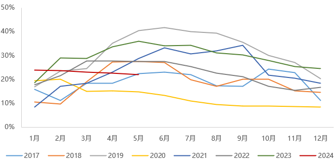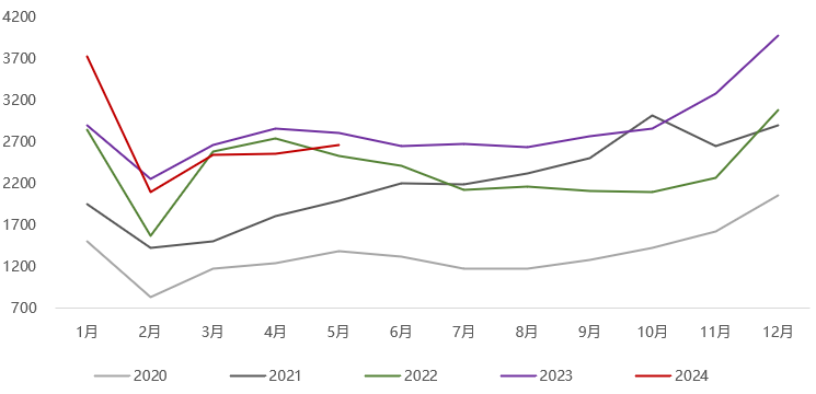 猪肉需求我们大致分为两类,一是库存需求,二是消费需求,其中库存需求主要观察冻品库存及市场鲜销率变化。冻品库存自2023年5月以来呈现连续回落态势,卓创数据显示截止2024年5月,冻品库存为21.96%,同比去年下降14个百分点。一般来说,上半年为冻品做库存的旺季,但今年春节后呈现屠宰、鲜销及冻品库存的三重下调,即现货低价也未使得冻品商囤货热情高涨,下半年冻品库存有望继续下降至历史偏低位置。冻品虽不会直接影响毛猪价格表现,但需关注低库存水平下,现货若出现大幅回落,下方存在拖底力量。