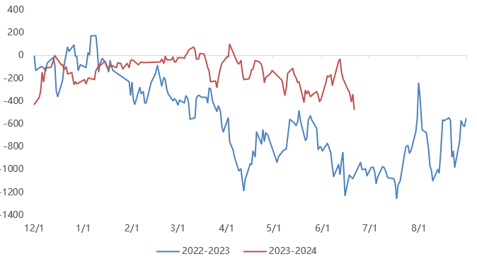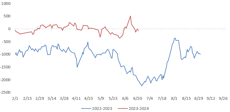 市场在经历了前几年的疯狂压栏二育后已经意识到过度压栏对后期猪价产生的毁灭性打击,尤其2022年的历史行情还历历在目,养殖端到底选择在短期内将部分风险释放,还是压栏至后期一致性出栏,目前存在分歧,尤其在现货高点已经触碰到20元/kg后,市场分歧加剧。另外,不同于往年的是:投机二育入场后,部分会选择在期货盘面套保,尤其近月或次近月合约升水当期现货的情况下,“投机套保”情绪较强。
