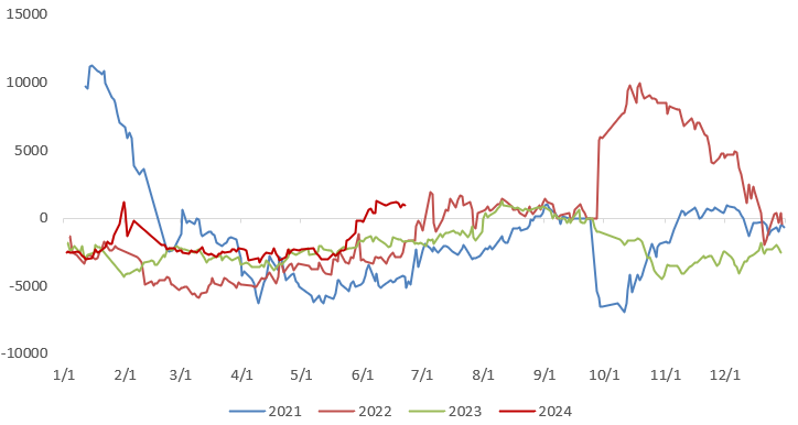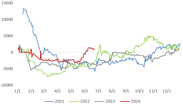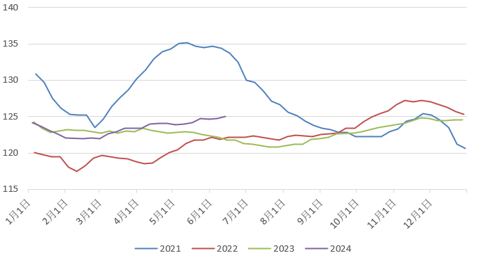 具体来看2024年上半年猪价表现:春节前现货出现明显拉涨,市场出现量价齐升的现象,说明需求增幅较大,待需求回落后,现货再次出现季节性回落趋势。春节后现货跌至14元/kg后获得支撑,但由于市场情绪相对偏谨慎,冻品及二次育肥介入程度低于往年,现货触底后缓慢回升至16元/kg一线,随后陷入区间震荡,直至5月猪价暴涨行情出现,猪价一度拉涨至20元/kg附近,其中价格涨至16-16.5元/kg后有加速趋势,各地二育加速入场进一步推高猪价,目前陷入冲高后的阶段性回调行情中。伴随着猪价重心的不断上移,生猪出栏体重不断增长,目前已经高于2022及2023年同期水平,但市场堰塞湖是否已形成,或者形成后何时释放是未来要考虑的问题。