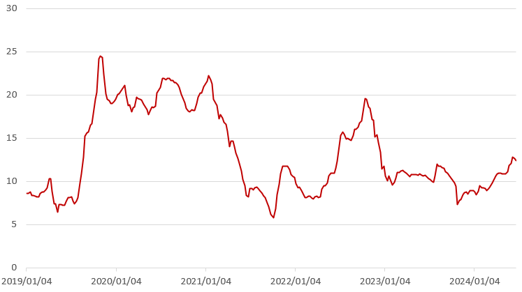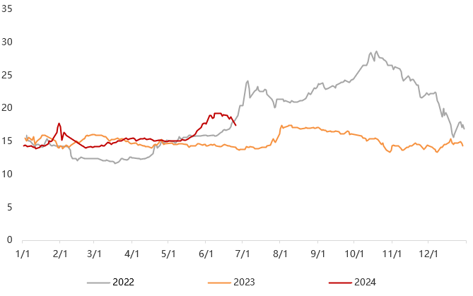 另外,猪价需求淡季下跌更多是由于基础供应过剩导致的,肥猪表现明显弱于标猪(超季节性的弱势),反之,严重供不应求下,肥标价差会跟随猪价同步上涨。2024年的肥标价差整体表现偏中性,供应虽有缺口,但幅度有限,因此现货拉涨至高位后存在较强压力。总体来说,今年消费淡季面临的更多的是估值高位带来的出栏压力,而非恐慌抛售导致的价格暴跌风险。在需求旺季来临后,市场会面临前期积压产能与旺季需求的博弈,现货价格将进入新的平台。
