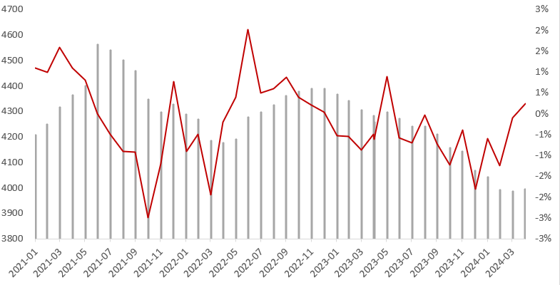 图2.1:能繁母猪存栏(万头)及环比变化(%)