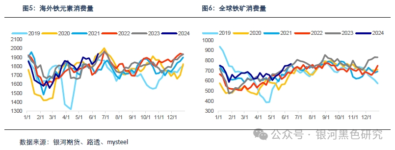 2024年一季度海外用钢需求维持较强韧性,一季度全球除中国外粗钢产量21253万吨,同比增加7.3%/1440万吨,全球除中国外生铁产量10447万吨,同比增加1.9%/190万吨,海外铁元素总消费量23624万吨,同比增加9.4%/2000万吨。海外铁元素消费量维持去年下半年较高水平,同时去年一季度低基数也是一部分原因。站在全球铁元素供需平衡表的角度来看,2023年铁元素消费量的边际增量来自海外,今年上半年边际增量依然来自海外,呈现出来的一个特征就是铁矿估值明显高于国内定价的钢材,且这一格局在今年下半年很难看到显著的改变。进入7月份,海外铁元素消费量预计会延续当前偏高水平,整体海外市场高需求有望在上半年得到延续。