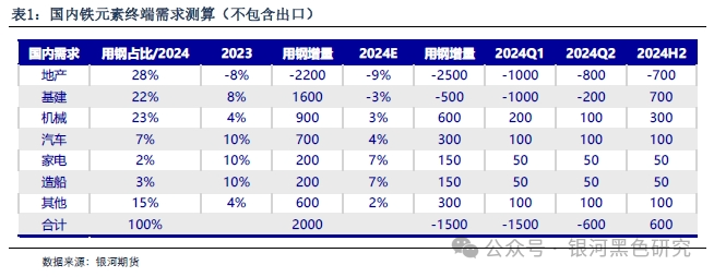 2024年年初至今,国内铁水产量同比回落4.1%/1600万吨,粗钢产量同比回落1.9%/900万吨(修正后),国内建材消费量同比回落13.5%/2500万吨,非建材消费量同比增长5%/1000万吨,国内钢材(包括钢坯)净出口增加800万吨,由于建材需求大幅低于市场预期,年初至今国内总需求同比回落4.8%/2000万吨。