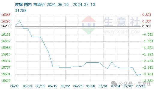 进入7月,棉花市场基本面变化不大,国内外棉花延续供应充裕而需求疲软的形势,行情总体维持弱势。据生意社商品行情分析系统,7月10日3128B级皮棉现货价格在15681元/吨,较月初下跌0.61%,环比下跌3.4%。