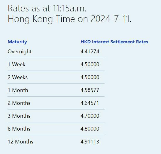 7月11日,港元拆息持续偏软,其中,隔夜拆息微跌8基点至4.41274%,见逾一周新低;与楼按相关的一个月拆息亦结束三连升,报4.58577%。