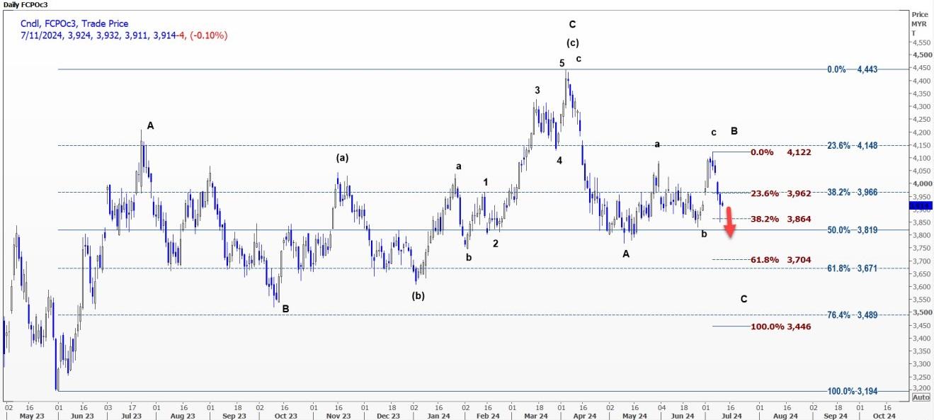 棕榈油FCPOc3可能重新测试每公吨3876林吉特的支撑位,因为其跌势似乎尚未结束。
