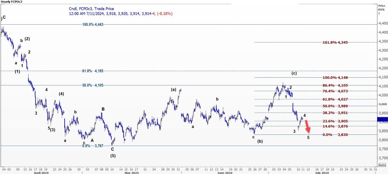 尽管跌幅很大,但预计跌势将延续至c浪底部3830林吉特。波浪形态还表明,下跌的最后一浪5浪尚未出现。