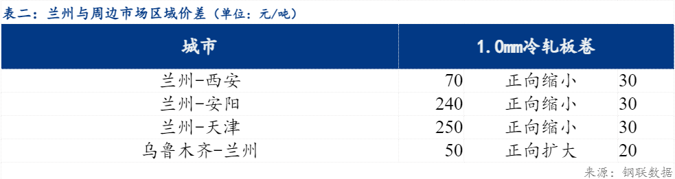 价差方面看,今日兰州与西安市场、安阳市场、天津市场价差缩小30元/吨,与乌鲁木齐市场扩大20元/吨。品种价差看,今日镀冷价差维持不变,冷热价差缩小30元/吨。