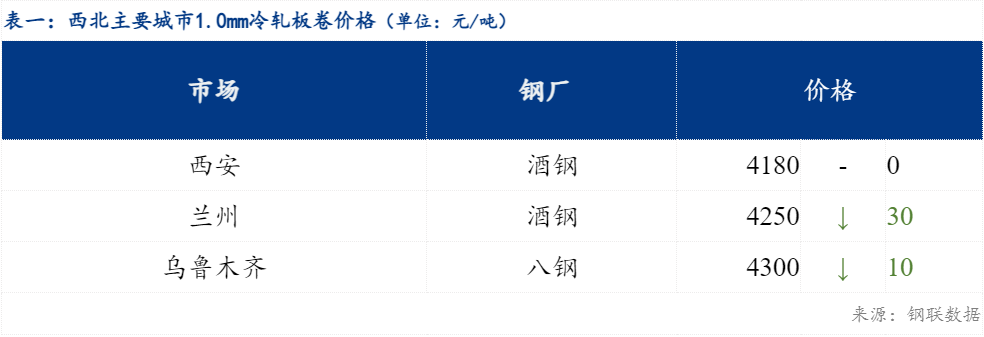 今日西北地区冷轧板卷价格部分下跌,现区域主流市场1.0mm冷轧板卷价格在4180-4300元/吨。市场方面,今日热卷期货盘面博弈加剧,市场现货价格维持偏弱运行,目前处于传统淡季,下游终端采购以刚需为主,采购不连续。
