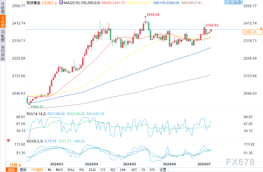 汇通财经APP讯——周四(7月11日)欧盘时段,金价连续第三个交易日走高,从近期的跌势中恢复过来,升至每盎司2385美元附近水平。近期跌势曾将金价推至每盎司2349美元的支撑位。