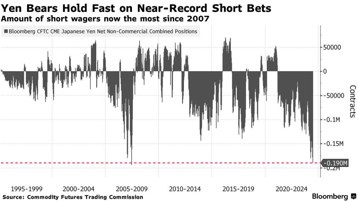 投机交易员已经积累了大量看跌日元的押注。根据美国商品期货交易委员会截至7月2日当周的数据,非商业交易员目前持有约189,560份押注日元将在未来几周下跌的合约(价值约147亿美元),这是自2007年以来最多的。