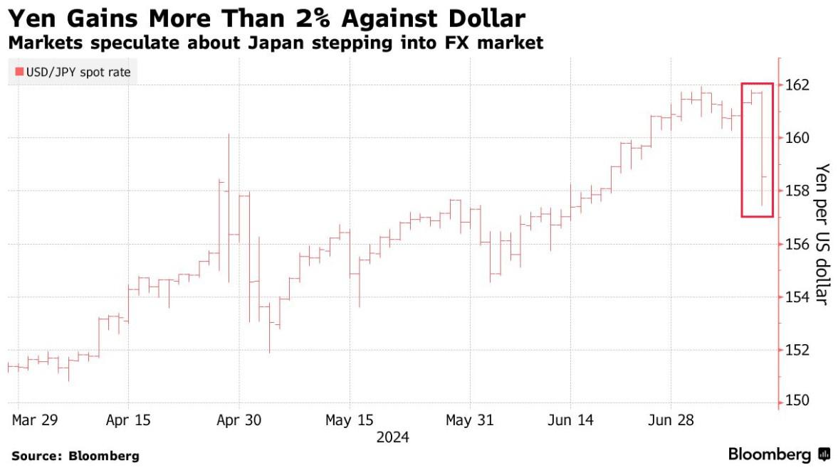 在美国经济数据公布后的几分钟内,日元兑美元一度上涨4日元,至1美元兑157.44日元,交易量的激增让人想起了日本当局过去的干预行动。