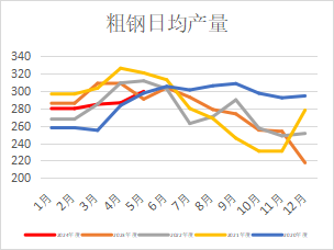 图15:粗钢产量累计同比(%) | 图16:粗钢日产(万吨) |