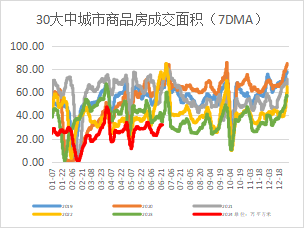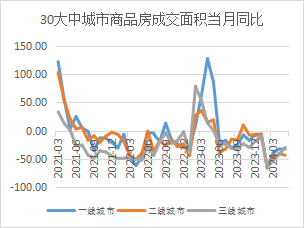 图5:30大中城市商品房成交面积(万平方米) | 图6:30大中城市商品房成交面积当月同比(%) |