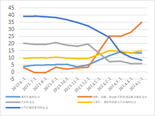 制造业投资保持平稳。今年以来,在四五月份原材料行业固定资产投资回升、大规模设备更新政策作用下制造业技术改造投资同比增长,以及出口复苏带动中下游外向型制造业投资的修复,使得我国制造业维持了一定的高景气度。