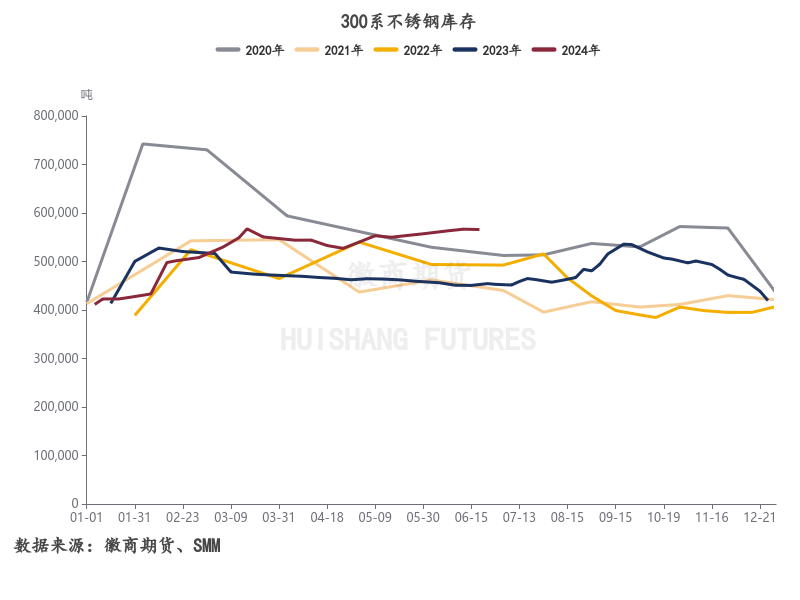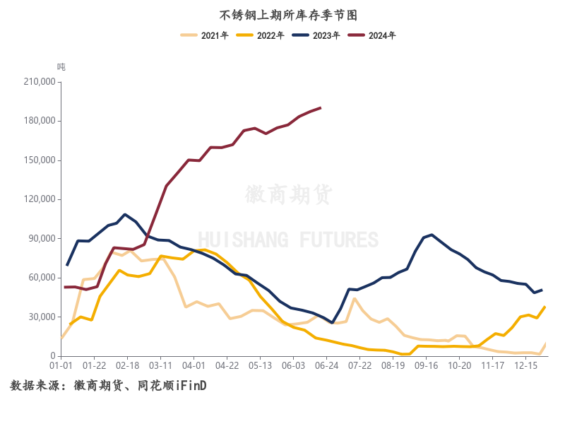 当前基本面的压力主要集中在库存端,无论是社会库存还是上期所仓单,不锈钢都显示出了季节性更差的表现。截至6月21日,不锈钢总库存共计984555.86吨,同比增加约30.33%,上期所仓单库存190310吨,同比增加约600%,处于绝对的高位。前期由于投机资金拉涨远月升水锁库存,近月的仓单压力并未在市场显现,随着6月不锈钢产量爬坡以及下游需求步入淡季,6月社会库存持续累积,市场的库存压力进一步加剧,但6月底累库幅度有所减缓。考虑到当前钢厂利润承压,不排除后期不锈钢厂为降低亏损或有减产计划,市场通过压缩供应的方式高位缓慢去库。