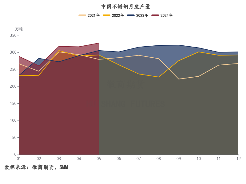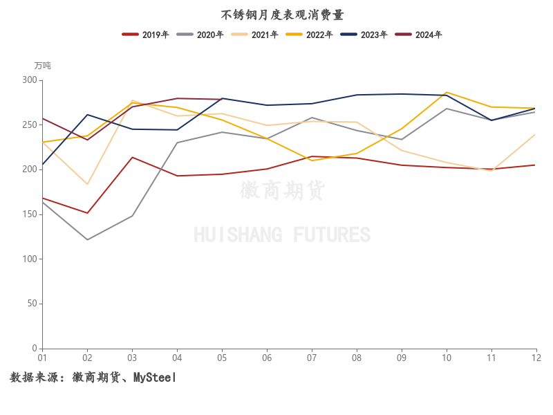 回到不锈钢上半年自身的供需基本面上,整体呈现出“减产有限,需求偏强,库存高企”的情况。供应方面,一季度受春节影响,钢厂开展常规检修,但受不锈钢价格上涨后,钢厂生产利润有所增加,减产力度有限。Mysteel数据显示2024年2月国内43家不锈钢厂粗钢产量257.03万吨,月环比减少17.05万吨,月环比减少6.22%,同比减少8.44%。二季度开始,随着不锈钢价格的上涨,钢厂生产意愿进一步提升,其中4月同比增加8.93%,5月同比增加7.18%,高于近三年同期水平。需求方面,不锈钢表观消费表现依旧偏强,内需同比增速保持在15%以上,且大部分月份都高于近五年同期水平,其中一季度出口需求表现最为抢眼,终端需求表现上来看,因地产板块的拖累,更多为按需采购,表现较为平淡。整体来看,不锈钢自身延续供需过剩格局,国内实际需求表现依旧偏弱,下游终端有一定负反馈的压力,更多盘面还是在交易宏观预期。
