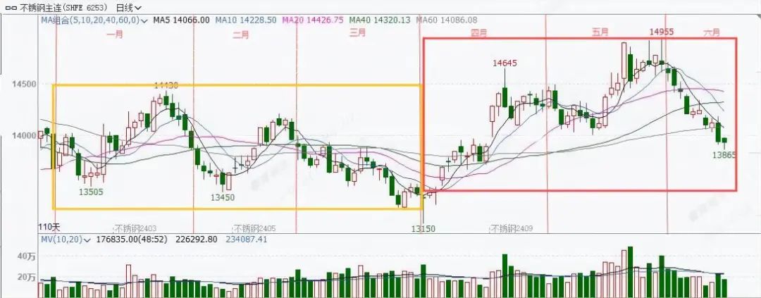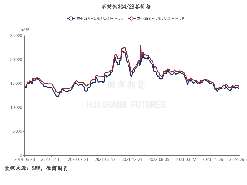 相较于上半年期货盘面波动,现货整体变化较慢,跟随期货盘面变化性较差。在不锈钢自身供需过剩的背景下,社会库存去化压力较大,钢厂和贸易商利润承压,现货市场以低价出货情绪为主,信心较差,上半年无锡市场不锈钢304/2B卷板平均价格区间在13500-14200元/吨左右,较期货波动较小。
