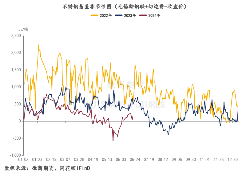 上半年来,不锈钢基差波动幅度高于往年同期水平,呈现出由正转负后再度转正的走势,大部分时间运行低位运行在0轴线上方,现货价格整体稍强于期货价格。其中,2月基差位于高位,不锈钢期货价格下行,带动基差由1月的40-440元/吨上涨至600-800元/吨。4月下旬后,在宏观投机资金的驱动下,不锈钢期货价格被快速拉涨,基差缩小至-580元/吨左右,后随着6月投机资金跟随宏观逻辑转弱,基差逐渐向上修复至0轴线上方。