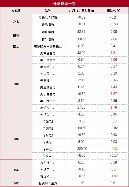 隔夜,LME铜收跌80美元,跌幅0.82%,LME铝收跌3美元,跌幅0.14%,LME锌收跌5美元,跌幅0.17%,LME镍收涨5美元,涨幅0.03%,LME锡收跌820美元,跌幅2.33%,LME铅收涨19美元,涨幅0.9%。消息面:美国6月CPI同比升3%,回落至去年6月以来最低水平,预估升3.1%,前值升3.3%。中国6月CPI同比上涨0.2%,环比下降0.2%;6月PPI环比下降0.2%,上月上涨0.2%。据SMM调研数据,6月份国内铝型材企业的综合开工率为51.67%,环比下滑4.58个百分点。6月漆包线行业综合开工率为68.65%,同比下降0.33个百分点,环比下降0.39个百分点。据中汽协数据,6月汽车产销分别完成250.7万辆和255.2万辆,环比分别增长5.7%和5.6%,同比分别下降2.1%和2.7%。其中,新能源汽车产销分别完成100.3万辆和104.9万辆,同比分别增长28.1%和30.1%。最新全国主流地区铜库存减0.94万吨至38.86万吨,国内电解铝社会库存减0.18万吨至78.92万吨,铝棒库存增0.02万吨至14.67万吨,七地锌库存增0.08万吨至20.67万吨。金属库存小幅回落,欧洲率先降息,美联储按兵不动,美元震荡。操作建议,短线偏空交易思路为主。观点仅供参考。