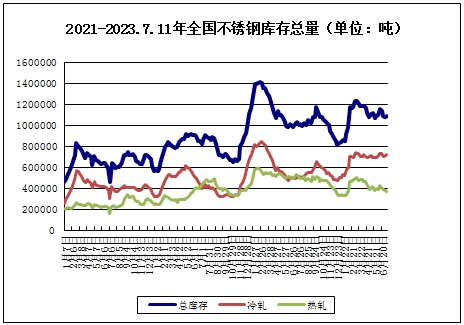 本周不锈钢库存合计108.77吨,较上周上涨0.63%,其中,冷轧库存上涨,热轧库存下跌。