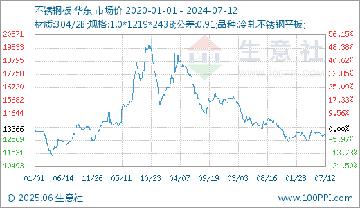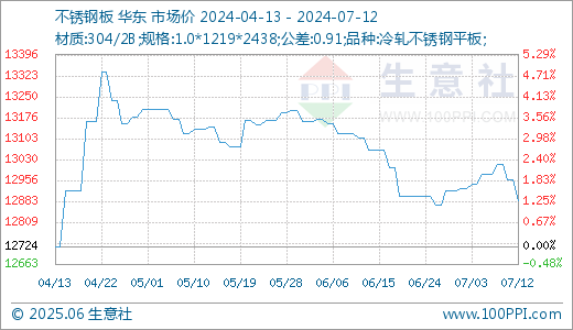 据生意社价格监测,本周不锈钢价格小幅下跌。截止7月12日,现货304/2B不锈钢平板1.0*1219*2438(公差0.91)的日均价为现报价12885.71元/吨,较周初下跌0.99%,同比下跌4.3%。