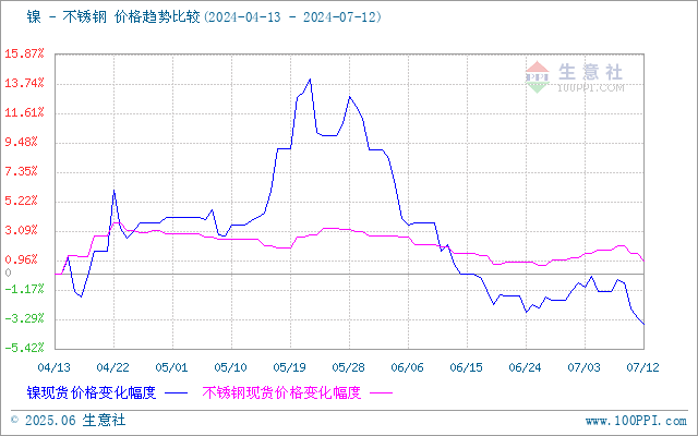 据生意社价差分析工具显示,镍和不锈钢价格相似。近期镍和不锈钢价格都小幅下跌。