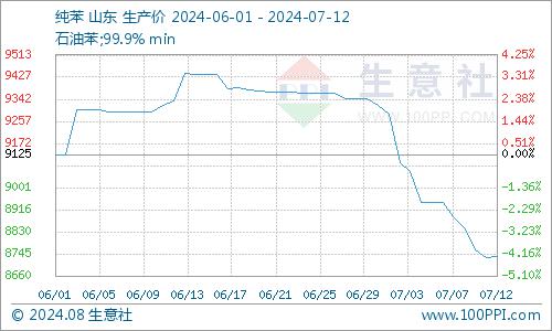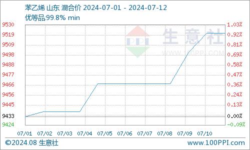 据生意社商品行情分析系统显示,7月1日山东苯乙烯价格在9533.33元/吨,7月12日价格在9521.67元/吨,涨幅0.94%。当前价格较去年上涨26.67%。