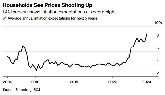 由于日元走软加剧了日本家庭生活成本压力,日本家庭对未来几年的通胀率预期达到创纪录水平,这可能会为日本央行近期再度加息提供支撑。