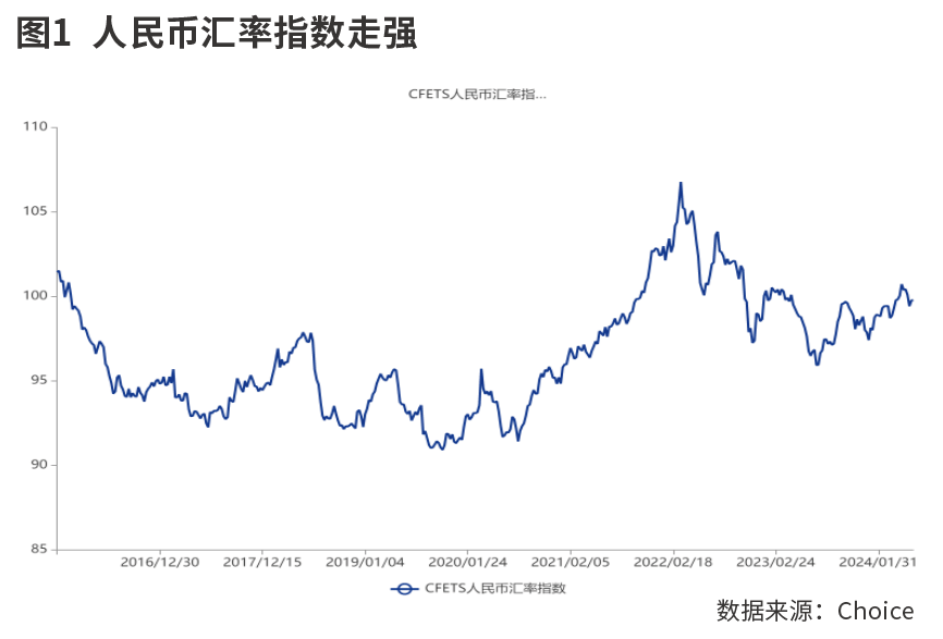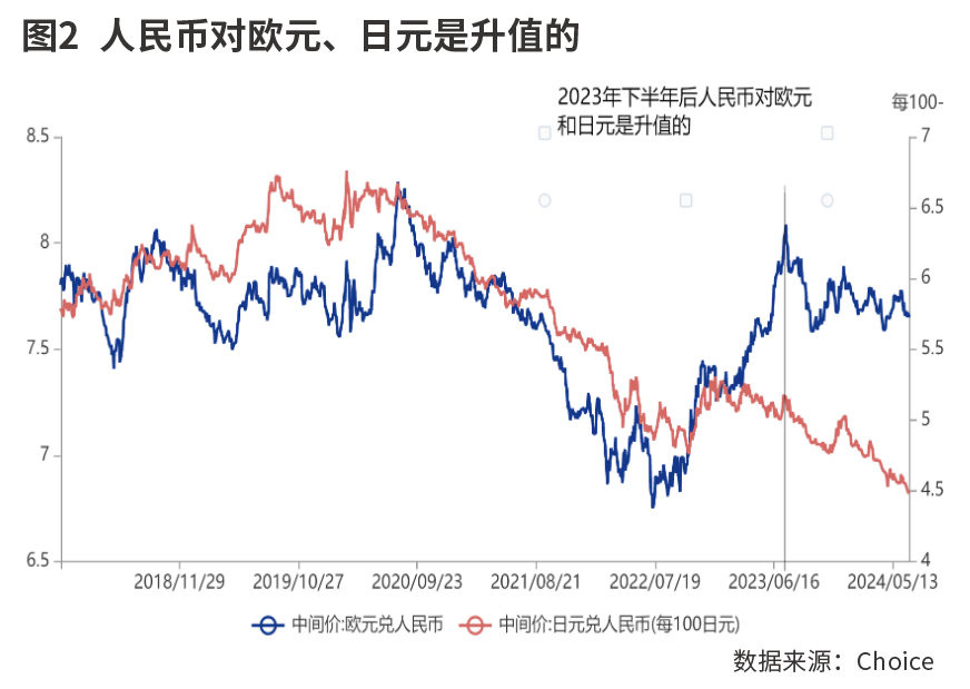 2023年下半年是一个重要的节点,美联储结束了最后一次加息,此后进入了降息预期阶段,再加上中国经济复苏强度的不断回升,人民币汇率也随之逐步走强。如果仅观察人民币对美元的变化,则不容易看到这种大的变化趋势,但这一时期人民币对欧元、人民币对日元都有不同程度的升值。2023年7月以来,人民币汇率指数从96已经回升到100附近。