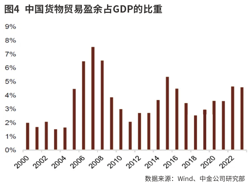 从经常收支看,近两年中国货物贸易顺差占比有所提升。2023年中国的货物贸易顺差约占GDP的左右,相较疫情前2019年的2.95%有显著的提升。中金公司认为,大额的贸易顺差意味着中国在不断对外累积净资产,意味着贸易竞争力和对外支付能力持续维持在偏高水平。自2023年下半年起,中国的出口增速同比已经开始了稳定修复的过程。在2017年和2020年的两轮人民币升值周期中,出口同比增速的恢复都是领先指标。