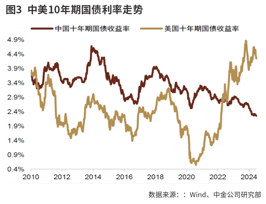 从国外来看,虽然美联储未来的降息仍迟迟未定,但全球降息的序幕已经拉开,未来发达经济体将逐渐告别高通胀导致的高利率环境,国内外的货币政策周期差将趋于收敛。