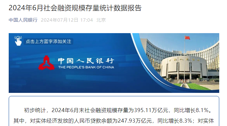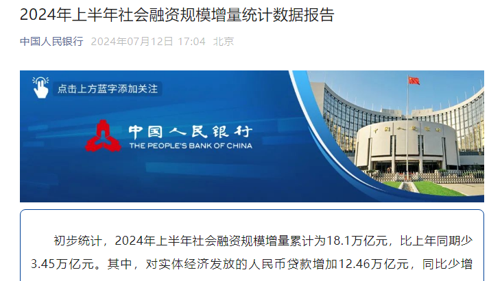 7月12日,中国人民银行发布《2024年6月社会融资规模存量统计数据报告》《2024年上半年社会融资规模增量统计数据报告》《2024年上半年金融统计数据报告》。
