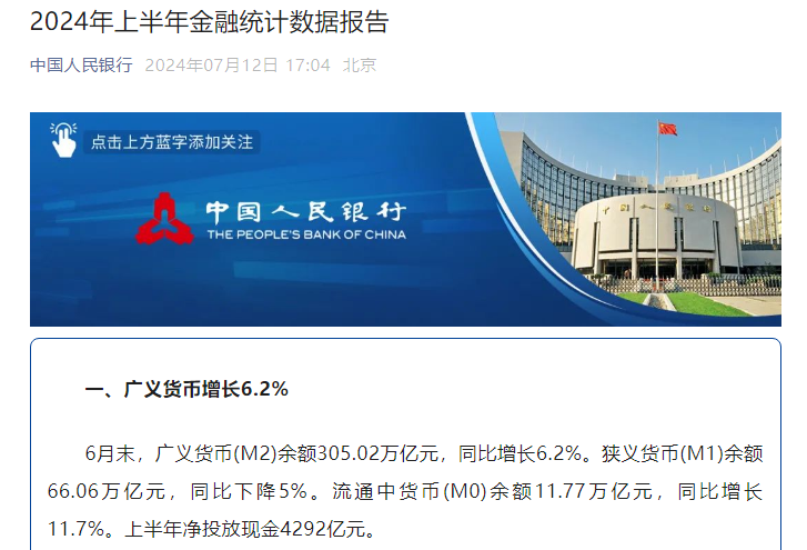 6月末,广义货币(M2)余额305.02万亿元,同比增长6.2%。狭义货币(M1)余额66.06万亿元,同比下降5%。流通中货币(M0)余额11.77万亿元,同比增长11.7%。上半年净投放现金4292亿元。