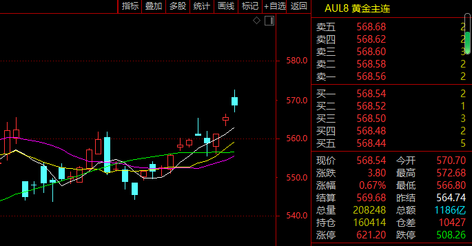 虽然7月12日国际贵金属价格开盘有所回落,但受此前外盘带动,7月12日国内期货市场沪金主力合约应声上涨。截至12日下午收盘,沪金主力合约2410报收568.54元/克,当日涨幅0.67%,较7月初已上涨3%。