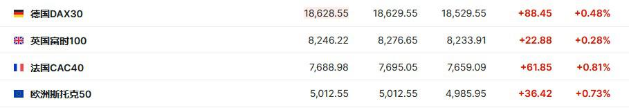 2.截至发稿,德国DAX指数涨0.48%,英国富时100指数涨0.28%,法国CAC40指数涨0.81%,欧洲斯托克50指数涨0.73%。