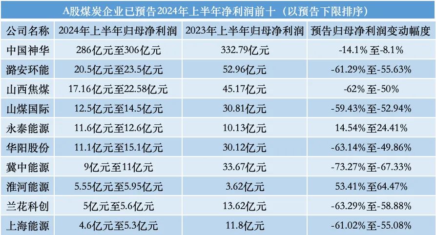 尽管“煤炭一哥”中国神华拿下断层第一,但相较于去年同期实现归母净利润332.79亿元,仍然同比下探8.1%至14.1%。与此同时,潞安环能、山西焦煤、山煤国际预计,今年上半年归母净利润同比分别下降55.63%至61.29%、50%至62%、52.94%至59.43%。