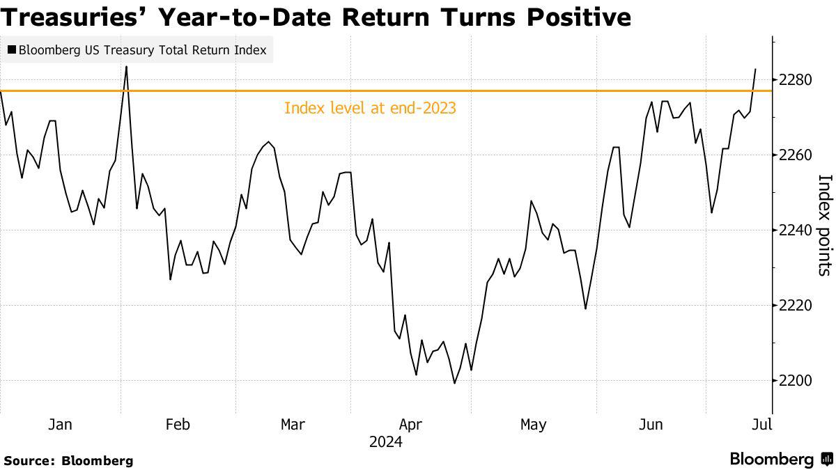 本周以来的各期限美国国债价格大反弹浪潮,帮助衡量美国所有期限国债价格整体趋势的彭博美国国债指数(Bloomberg US Treasury Index)在本周抹去了其2024年的全部价格跌幅,将该指数回报率推至0.3%,甚至全面抹去了今年4月份一度高达3.4%的跌幅。