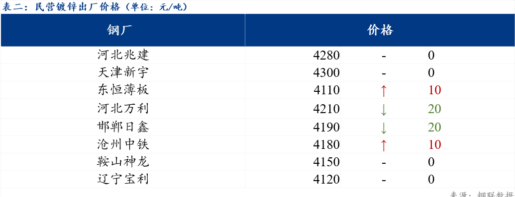 现北方地区民营镀锌板卷整体出厂价格在4110-4300元/吨。