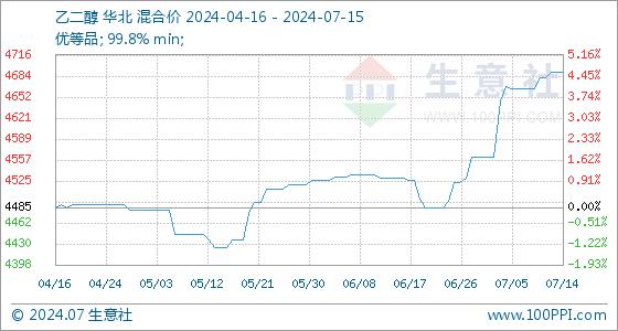 7月15日,生意社乙二醇基准价为4690.00元/吨,与本月初(4561.67元/吨)相比,上涨了2.81%。