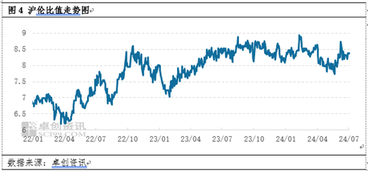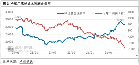 一方面,锌精矿供应紧张,冶炼厂原料库存短缺,加工费持续下滑,冶炼厂利润持续亏损,亏损空间逐渐扩大,成本端给到价格支撑。根据卓创资讯测算数据显示,自2023年四季度开始,冶炼厂炼锌点对点利润不断下滑,2024年初附近下滑至亏损局面,到6月份已经下滑至1000元/吨附近,跌幅较大,且已经影响至生产端的生产开工情况,从而给到价格支撑。