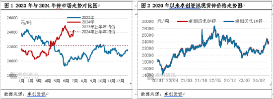 2024年上半年,锌价格呈现出先震荡后上涨的表现,其走势与我们在《2023-2024中国锌市场年度报告》中的预测基本一致,但行情上涨阶段略有分歧,年报中我们预测上半年或表现出上涨的行情,上涨开始于2月份,实际来看,2024年上半年上涨行情始于4月份,1-3月份震荡为主。偏差主要在于:1-3月供强需弱,行情上行乏力,下行有支撑;4月之后,成本支撑凸显,叠加有色金属领域铜、稀贵黄金白银等纷纷上涨,带动锌市场情绪乐观,行情上移。上半年来看,月均价高点出现在5月份,这同年报预测一致。具体数据来看,2024年1-6月份,国内卓创资讯现货0#锌均价为22180元/吨,较去年同期涨0.2%(见图1);截至6月28日,国内卓创资讯现货0#锌均价为24260元/吨,较年初下滑1.39%(见图2)。